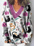 Halloween Black Cat Art Print Knit V-neck Pullover Sweater